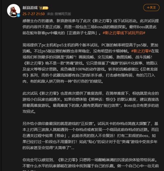 今日新浪游戏发文,分享了《影之刃零》线下试玩活动的体验感受。