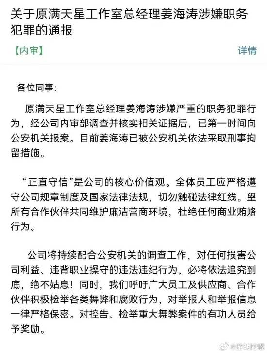 据游戏陀螺报道,中手游内部发布公告称,原满天星工作室总经理姜海涛涉嫌严重的职务犯罪行为,经公司内审部调查并核实相关证据后,已第一时间向公安机关报案。目前姜海涛已被公安机关依法采取刑事拘留措施。