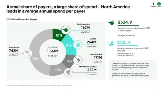 注:该报告基于过去六个月的数据分析,北美玩家每年人均花费高达 325 美元,欧洲玩家为 125 美元,远高于全球其它地区。