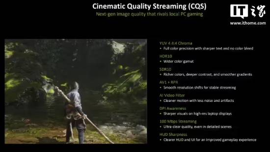 此外,如果用户有足够的带宽,GFN 现在允许以 5K 分辨率(适用于 16:9 显示器和超宽显示器)以 120fps 的帧率进行串流,或者在 1080p 下以高达 360fps 的帧率进行串流。此外,英伟达还推出了一种新的可选“电影级画质串流模式”,声称可以减少画面色彩溢出,并在串流过程中恢复场景中黑暗和模糊区域的细节。用户现在可以以高达 100Mbps 的速度进行串流,高于之前的 75Mbps,以维持这种画质(其使用 HDR10 和 SDR10,采用 YUV 4:4:4 色彩采样,通过 AV1 进行串流,并添加了 AI 视频滤镜以及一些优化,以使文本和 HUD 元素更加清晰)。