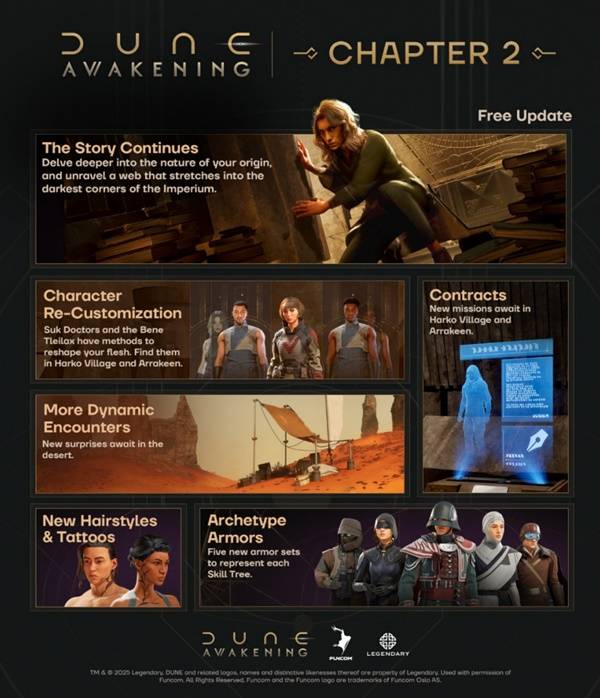 开放世界生存制作游戏《沙丘:觉醒》(Dune: Awakening)的开发商 Funcom 在 Into the Infinite 发布会上揭晓了厄拉科斯星球(Arrakis)的未来发展规划。游戏将于9月10日推出第二章,也是首个大型免费内容更新,延续扣人心弦的主线剧情(第一章以悬念收尾),并加入全新世界内容与任务。与此同时,全新独立剧情DLC “The Lost Harvest(失落的收获)”将同步发售,售价12.99美元,将带来独立的全新故事线与多款独特皮肤奖励。