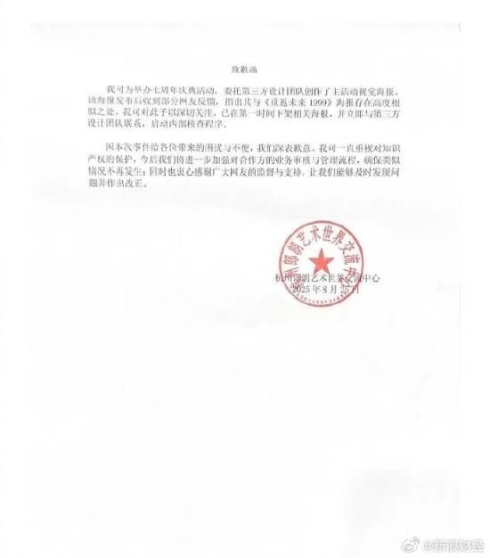 我司为举办七周年庆典活动,委托第三方设计团队创作了主活动视觉海报。该海报发布后收到部分网友反馈,指出其与《重返未来 1999》海报存在高度相似之处。我司对此予以深切关注,已在第一时间下架相关海报,并立即与第三方设计团队联系,启动内部核查程序。
