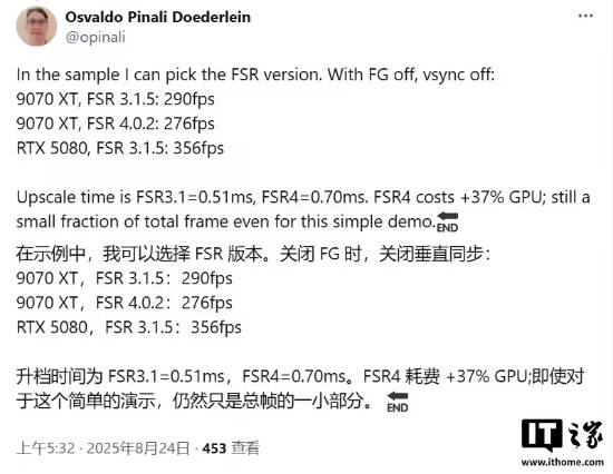 科技媒体 WccfTech 昨日(8 月 25 日)发布博文,报道称在 Radeon RX 9070 XT 显卡上,AMD 最新 FSR 4 超分技术显著提升画质,但会增加 GPU 负载,导致帧率略降。