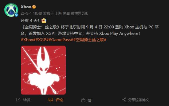 《空洞骑士:丝之歌》本作将于2025年9月4日正式发售,登陆NS/NS2/Steam/PS/Xbox平台,首日加入XGP。今天据这款备受期待的续作发售还有4天。