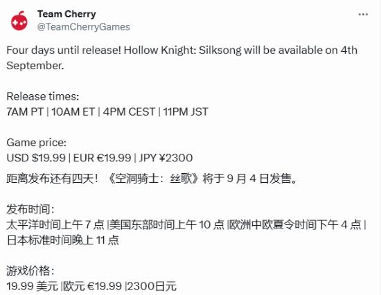 另外值得一提的是,开发商Team Cherry也于今日公布了游戏的售价为19.99 美元/19.99 欧元/2300 日元,与此前泄露的情报一致,也意味着《丝之歌》将延续前作《空洞骑士》的亲民定价策略。