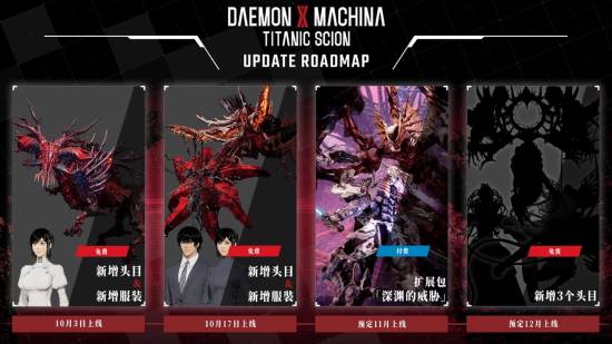 《机甲战魔:神话之裔》的更新计划现已公开,第一弹内容将于10月3日上线,在免费更新第1弹中,据点的“模拟器”将追加全新再战任务“与残酷RT:Ω的战斗”。除此之外,为纪念游戏发售,“2种发型组合包”与“2种感情动作组合包”现已在各大商店免费开放下载。