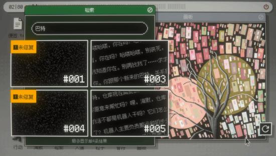 地图上存在一些损坏数据导致道路不通,这时玩家需要利用游戏中的“检索”功能修复数据以修复地图。“检索”功能相当于一个小型数据库,包含了80段海默2000与其他角色的对话记录。这些内容一开始是隐藏的,当玩家在游戏进行中猜测某些词汇可能是关键词时,就可以检索其是否出现在这些记录当中并进行查看。查看记录,修复地图的同时,玩家也将了解到希望家园里更多的故事。