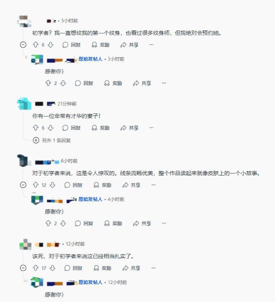 帖主向大伙展示了自己的新纹身,并开心地表示纹身师是自己的妻子,而且还是一个初学者。