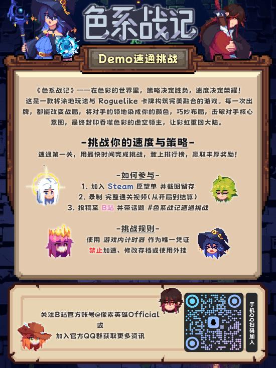 独立游戏《色系战记》今日正式宣布——Demo速通挑战活动将于 10月1日 上午9:00 全面开启!活动同步上线全新预告片,玩家们可提前一睹融合 涂地玩法与Roguelike卡牌构筑 的独特魅力。