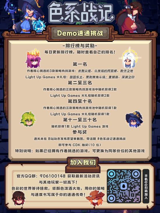 本次速通挑战将持续至 10月25日,玩家需要以最快速度通关Demo第一关,凭借游戏内置计时器登上排行榜,赢取丰富奖品。无论你是策略大师还是竞速高手,都能在这片充满色彩的战场上展现实力。