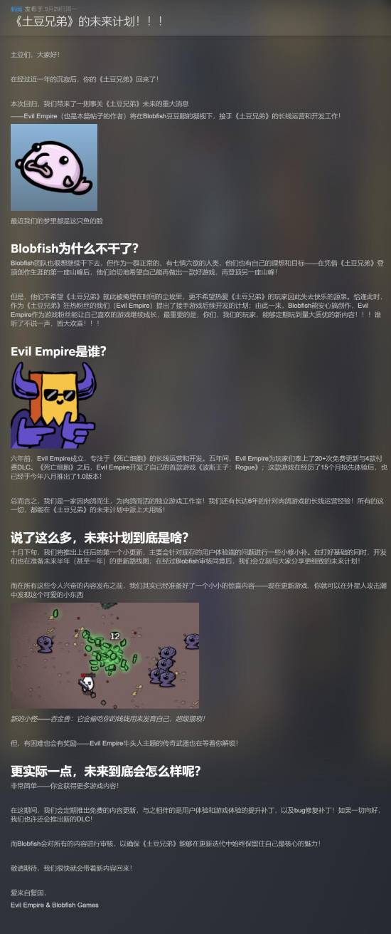 Evil Empire还预告了《土豆兄弟》的未来计划——今年十月,游戏将迎来新开发商上任后的首个大型免费更新!