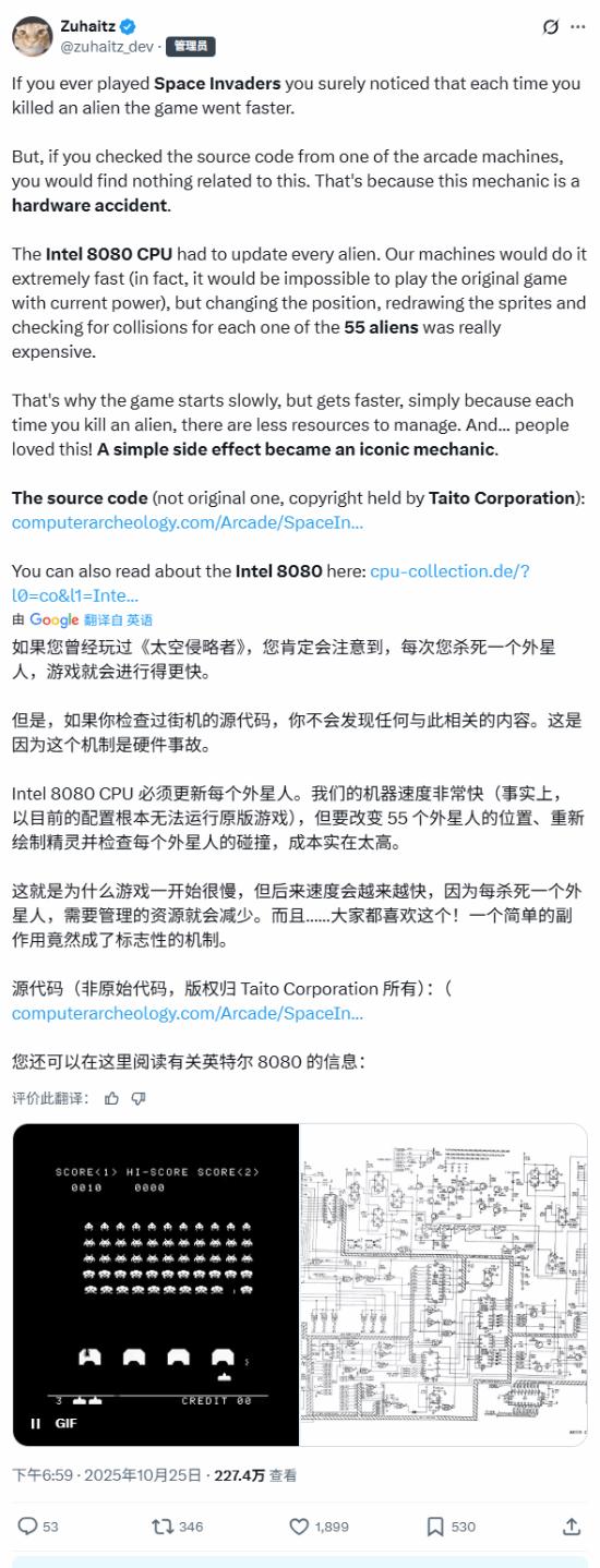 近日自称C/C++专家的Zuhaitz透露,这款Taito经典街机游戏的刺激强度不断上升,并非源于天才般的程序设计,而仅仅是因为底层的Intel 8080处理器存在性能瓶颈。