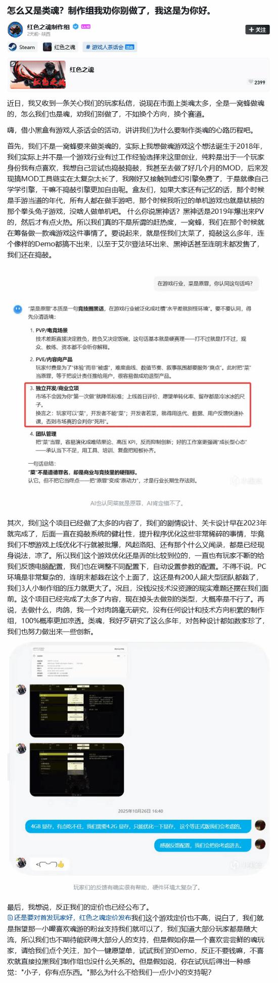 近日,制作组官方发文回应了网络上“类魂游戏太多,建议换个赛道”的评论。官方表示,制作魂游的想法最初诞生于2018年,彼时魂游的赛道还远远没有今天这样火爆。再加上经验不足,开发速度较慢,因此才拖到了今天。