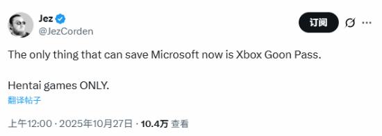 Windows Central执行编辑Jez Corden近日再次以戏谑口吻评论Xbox的现状,并在社交平台上表示:“现在唯一能拯救Microsoft的方法,就是推出Xbox Goon Pass,里面全是绅士(H)游戏。“