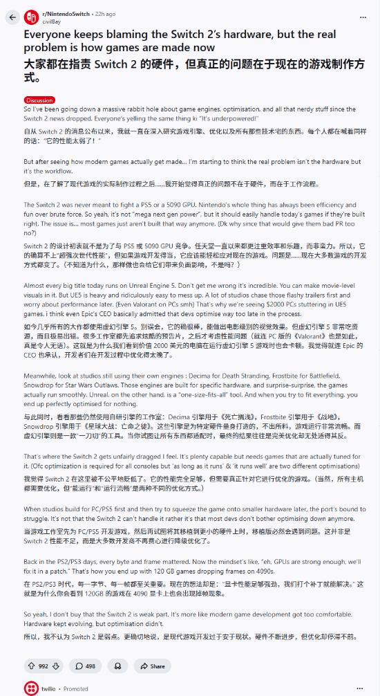 帖子指出,任天堂Switch2的性能争议实为现代游戏开发工作流程问题的缩影,而非硬件本身不足。作者认为,通用引擎的滥用与滞后优化文化才是导致多平台游戏性能表现不佳的核心原因。