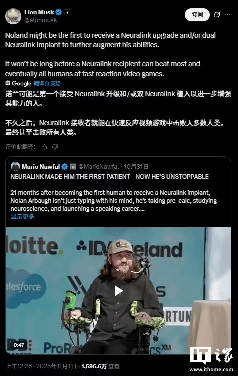 在回应中,马斯克表示,阿博可能成为首位接受 Neuralink 升级的患者。他在 X 平台上写道:“诺兰德或许会是首个获得 Neuralink 升级,甚至接受双侧 Neuralink 植入的人,以进一步增强其能力。在不久的将来,Neuralink 使用者将能在快速反应类电子游戏中击败大多数人,最终超越所有人。”