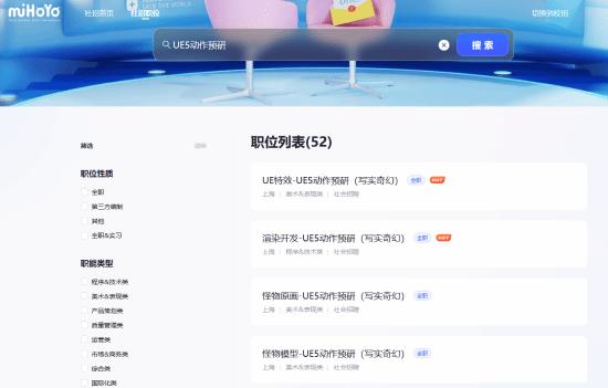 官网还提供了一个“加入创世”的选项,点击后会跳转到米哈游官方的招聘界面,列出了多达52个职位,从特效、美术、模型到策划、导演等一应俱全。