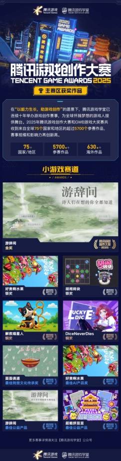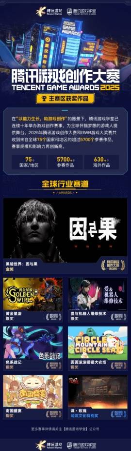 “2025腾讯游戏创作大赛”闭幕暨颁奖仪式在武汉顺利举行。本届赛事活动共收到全球75个国家和地区共计5744份参赛作品,活动现场,主赛区、《元梦之星》赛区、《王者荣耀》美术设计赛区三大赛区,以及GWB游戏大奖赛的获奖名单正式揭晓。
