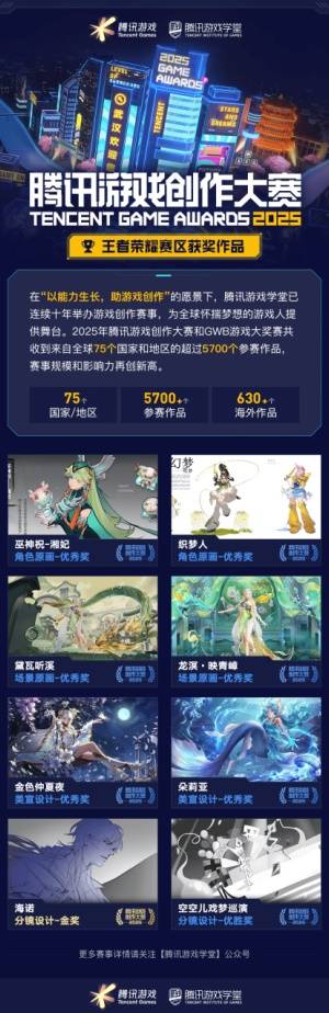 《王者荣耀》美术设计赛区共吸引740名参赛者报名,收到500份作品。除课程合作外,赛事还通过与中国美术学院毕业展腾讯专场、美术院校1v1定向开源宣传等多种形式,持续激发高校学生与青年设计者的参与热情,促进游戏美术创作与高校艺术教育的双向交流。