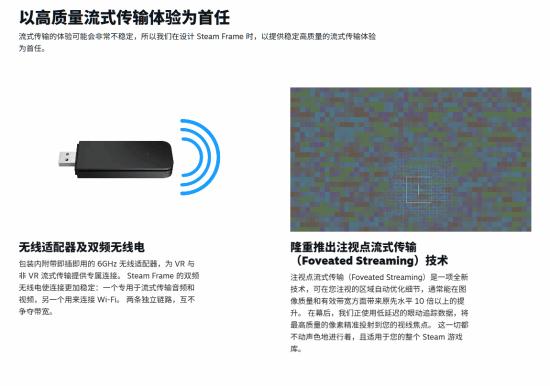 产品以“高质量流式传输体验”为首任,包装内附带即插即用的6GHz无线适配器,为VR与非VR流式传输提供专属连接。Steam Frame的双频无线电使连接更加稳定:一个专用于流式传输音频和视频,另一个用来连接Wi-Fi。