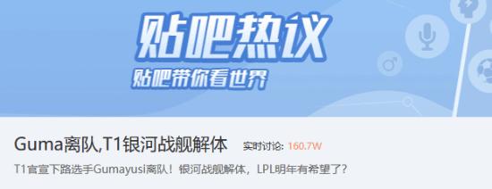 相关内容在贴吧也引起了热烈讨论,截至发稿,话题“Guma离队,T1银河战舰解体”的实时讨论已有160.7W,冲至贴吧热搜第1。