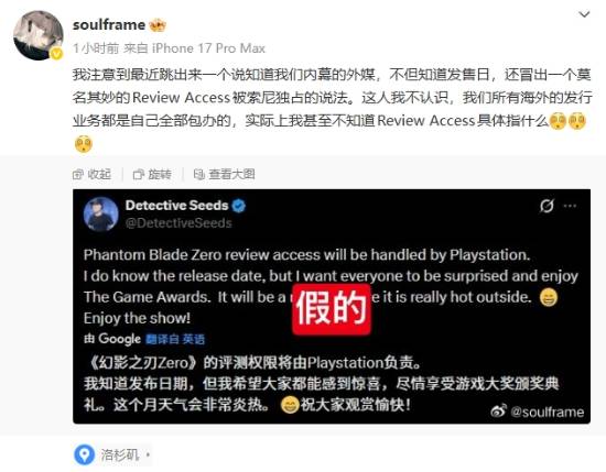 《影之刃零》制作人梁其伟在微博回应:“我注意到最近跳出来一个说知道我们内幕的外媒,不但知道发售日,还冒出一个莫名其妙的Review Access被索尼独占的说法。这人我不认识,我们所有海外的发行业务都是自己全部包办的,实际上我甚至不知道Review Access具体指什么。”