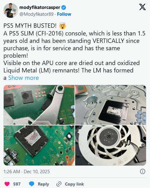 他在核心结论中写道:“主机摆放方式(竖置 / 横置)无法避免液态金属老化。即便是最新推出、仅使用了一年的改良型号,也会受此问题影响。根本原因在于液态金属的涂覆工艺水准,以及长期使用过程中受温度变化影响而产生的老化。”“所有 PS5 主机,无论型号,最终都需要专业的维护保养!”