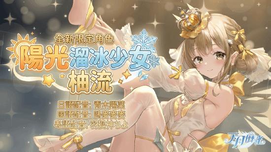 配合冬季主题,天月麻雀推出滑冰魔法少女「柚流」,这位新限定雀士有别先前雀士成熟的魅力,将以温柔可爱的风格温暖广大玩家。在 CV 方面,除先前提到 Vtuber 鸥麦麦麦为她的国语配音献声外。日语配音邀请到日本声优 青木阳菜 声演,而粤语部份则由香港 Vtuber 羽狐神ちよ 担任。