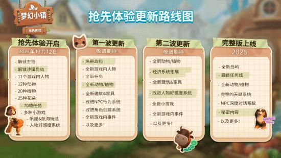 开发团队已同步发布《梦幻小镇》官方内容路线图,当前规划将分为四个重大更新阶段逐步呈现。