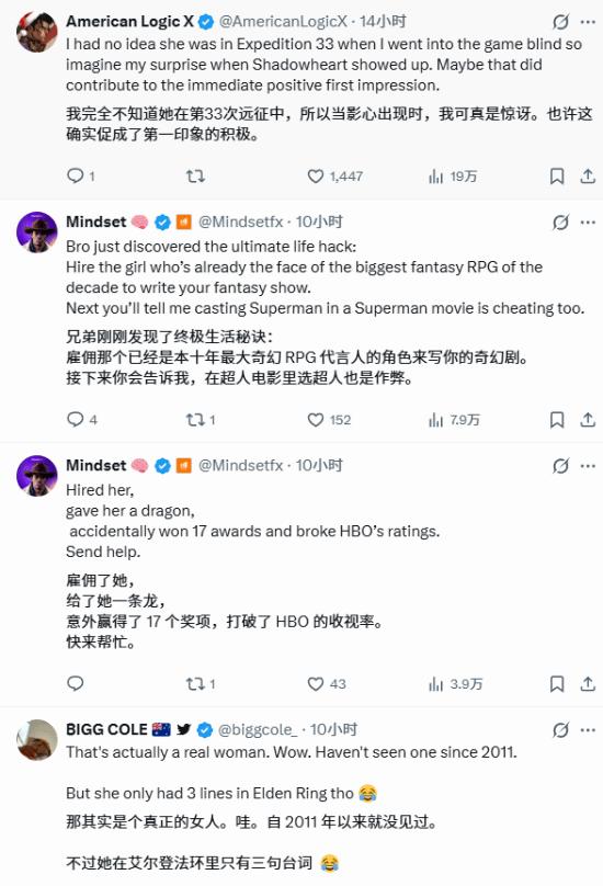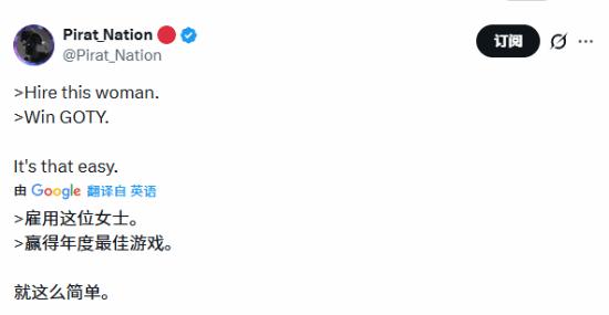 此次英格利希获奖的《33 号远征队》,是她近期参与的又一热门作品 —— 而她此前配音的《博德之门 3》《艾尔登法环》,均曾拿下 TGA “年度最佳游戏”。这一 “配音即伴生年度最佳” 的履历,让博主Pirat_Nation发文调侃:“雇这个女人,就能拿年度最佳,就这么简单”。