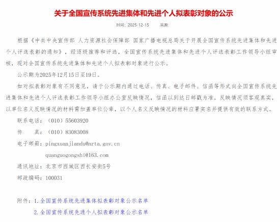 近日,国家广播电视总局官网发布《关于全国宣传系统先进集体和先进个人拟表彰对象的公示》,对拟表彰的共291个先进集体、682名先进个人进行了公示。