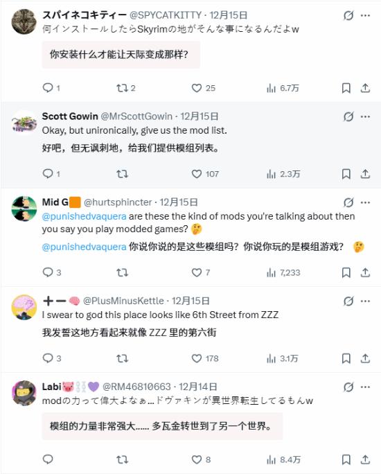 该模组将《上古卷轴 5》的原生场景替换为现代日式都市风格,画面中不仅有细腻的街道、店铺等环境建模,角色造型也贴合当代游戏审美,整体视觉表现已接近近年发售的作品。网友热议 “这是怎么做到的画质,太犯规了”。