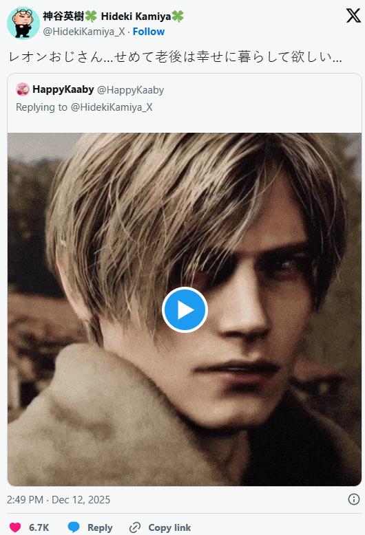 日本知名游戏制作人神谷英树也对里昂的新形象发表了看法,还谈及卡普空旗下不少经典角色年事已高的现状。他分享了一段展现里昂容貌逐年变老的影像,并评论道:“里昂大叔,起码我真心希望你能安享晚年啊。” 有网友回复称,自己虽能接受游戏角色变老,但还是期盼《生化危机》和《鬼泣》系列的角色都能拥有应得的圆满结局。神谷英树看到后回应道:“就算但丁迎来了幸福生活,他难道就不会一直穷下去吗?”