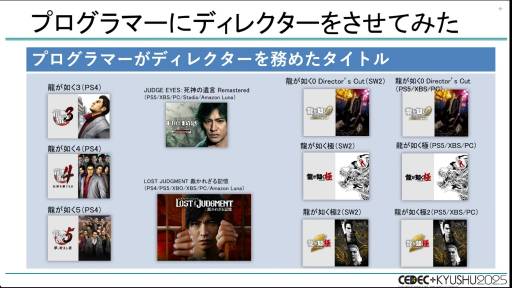 如龙工作室也采取了让参与过原版项目的程序员来担任总监的形式。结果,能够做出快速而准确的判断,在效率提升方面取得了巨大成果。伊东表示:“这一点我真心推荐。”