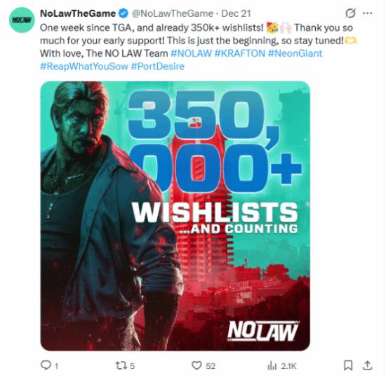 在2025年TGA颁奖典礼上惊艳亮相的3A开放世界生存游戏《NO LAW》,近日再传捷报:首曝首周,其Steam愿望单数量已突破30万,可见玩家对这款由《PUBG》发行商KRAFTON与瑞典知名工作室Neon Giant强强联手之作的高度期待。