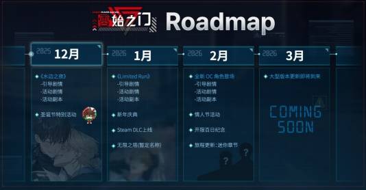 1月,将实装另一人气网漫 IP《Limited Run》联动内容,新增对应引导剧情与活动副本,并推出新年庆典活动、Steam 平台 DLC 发售,以及全新的重复挑战型玩法“无限之塔(暂定名)”。
