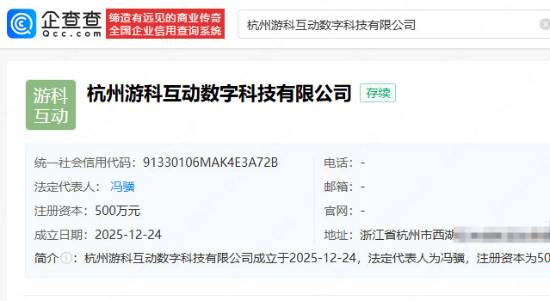 企查查APP显示,12月24日,杭州游科互动数字科技有限公司正式成立,法定代表人为冯骥。该公司经营范围涵盖互联网游戏服务、出版物批发与零售、动漫游戏开发等多个方向。