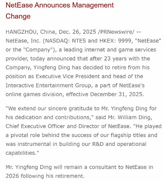 网易集团发布公告:公司执行副总裁、互动娱乐事业群负责人丁迎峰(丁丁)将于2025年12月31日正式退休。退休后,他将继续担任公司顾问职务。