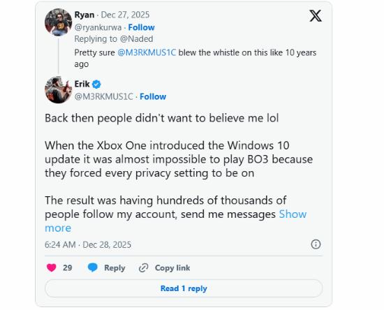 值得注意的是,这并非 Xbox 主机首次被曝出类似性能问题。音乐人 M3RKMUS1C 透露,约十年前 Xbox One 强制推送 Windows 10 更新时,其账户因默认开启所有隐私设置,收到数十万条关注请求和消息,导致主机频繁崩溃,《黑色行动 3》几乎无法游玩。