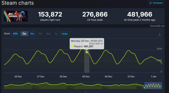 玩家们涌入“人类最后堡垒”已有两个月之久。自上线以来,Embark Studios的这款游戏就受人瞩目。更值得一讲的是,在刚结束的TGA颁奖礼上荣获“年度最佳多人游戏”后,这款游戏的人气只增不减。根据SteamDB的数据,其当前活跃玩家数量与游戏首发时的数据大致持平。在Valve平台上,《ARC Raiders》上月创下的最高同时在线玩家记录为481,966人。而上周日,该游戏仍有439,118名玩家在线。Embark Studios的努力显然正在得到回报。