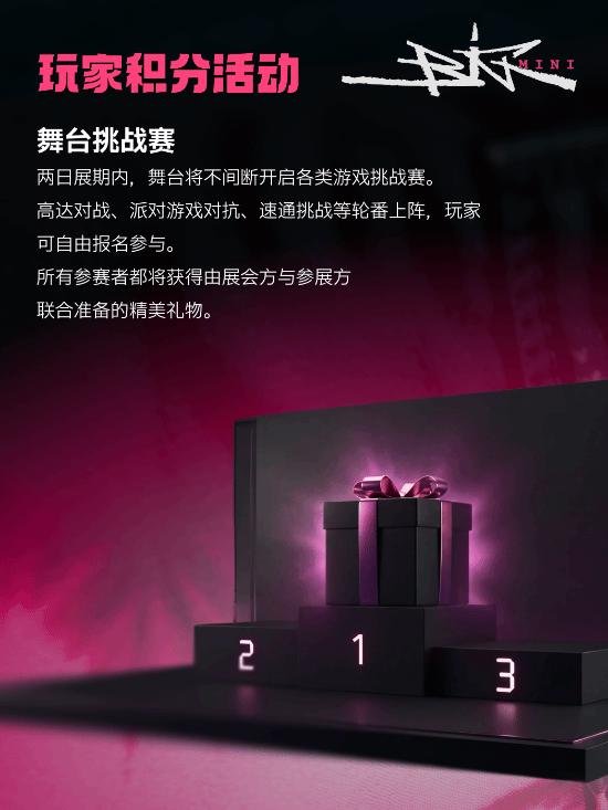 2.舞台挑战:两日展期内,舞台将不间断开启各类游戏挑战赛。高达对战、派对游戏对抗、速通挑战等轮番上阵,玩家可自由报名参与。所有参赛者都将获得由展会方与参展方联合准备的精美礼物。