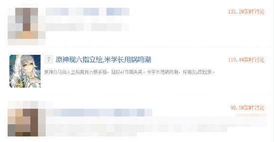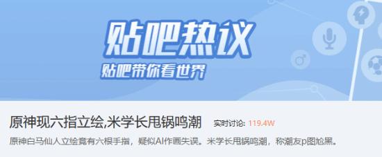 一些玩家将其解释为是AI作画失误,截至发稿,话题“原神现六指立绘,米学长甩锅鸣潮”在贴吧已有119.4W实时讨论,冲至贴吧热搜第7。