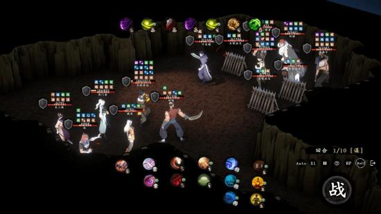 游戏的战斗部分采用了注重战前阵型布置的半自动回合制玩法。在准备阶段,玩家需要根据战场局势手动选择角色所要释放的功法,进入战斗阶段后,角色将根据技能指令及自身站位依次释放技能来打击敌人或保护己方队友。