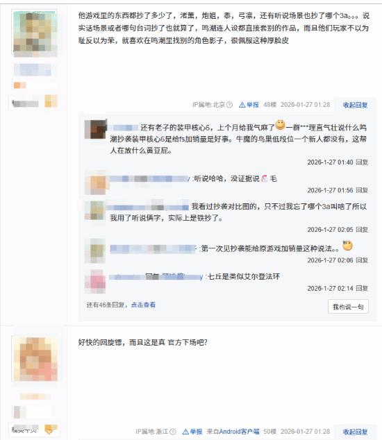 该视频是鸣潮官方主导的商单二创,并非普通玩家自发创作,因此玩家认为官方应对内容审核不严负责。随后该事件引发了明日方舟与鸣潮玩家的激烈争论,“尾气厂”(玩家对鸣潮的调侃称呼)的外号再次被提及,不少玩家认为这是鸣潮又一次 “借鉴” 其他二游的实锤。