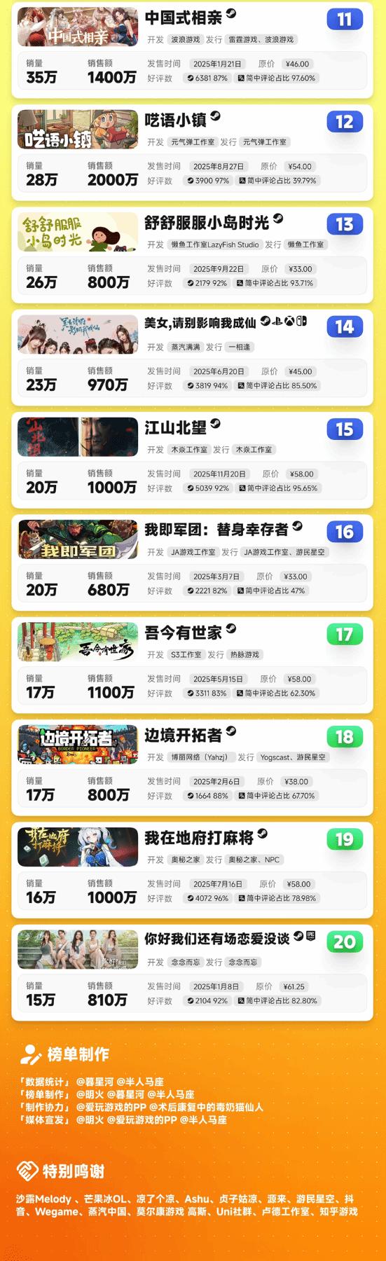 今日(1月29日),@国游销量榜公布了2025年国产游戏销量年榜。注意,该榜单仅录入2025年当年(1月1日至12月31日)新发售的“国产买断制游戏”,往年发售的长卖游戏不会登榜。除此之外,售价低于18元人民币,以及涉及某些题材的游戏不会列入榜单。
