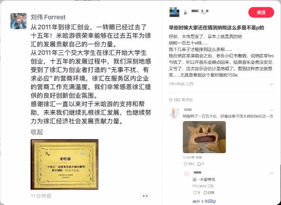 刘伟在文中提到,米哈游目前累计创税已达150亿元。他向徐汇区提供的良好创新创业氛围表示感谢,并明确表态米哈游未来将继续扎根徐汇,努力为当地经济社会发展贡献力量。