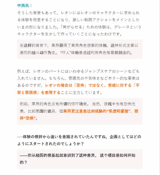 格蕾丝的部分更接近于《生化2》和《生化7》,着重打造恐怖体验;里昂的部分则更接近《生化4》,虽然紧张感极强,但并非专注于极致恐怖,而是一种更侧重于动作体验的生存恐怖。