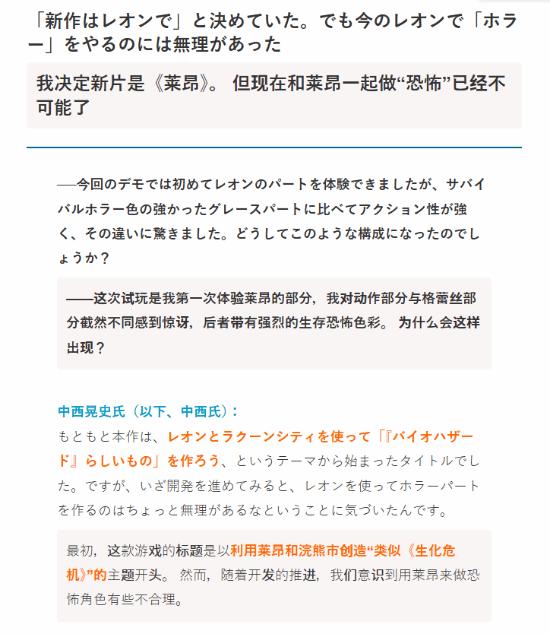 在接受日本媒体DenNicoFamiGamer采访时,中西总监被媒体问到为什么格蕾丝线和里昂线的风格差异如此显著,里昂有着大量张力极大的打斗而格蕾丝则没有。对此他回应道:开发者在《生化危机9:安魂曲》的时候,发现在用里昂做一个恐惧游戏的角色有些不太合理,因为在过去生化危机系列的故事经历之后,里昂明显更为成熟,成为了一名久经生死并且战斗经验丰富的特工,再让他在游戏中受到惊吓实在有些困难也不合理。