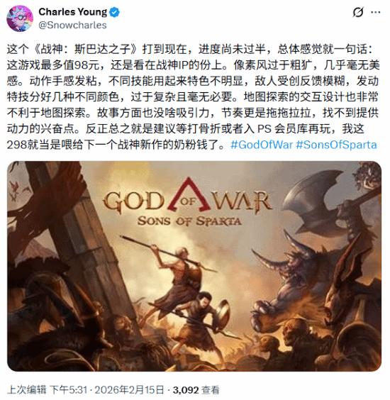 近日,前IGN中国主编Charles Young也发文提及了这款动作新游,他指出本作“最多值98元”,就这还是“看在战神IP的份上”,随后他还批评了游戏的手感、地图的设计和剧情上的缺陷,并总结表示“建议等打骨折或者入PS会员库再玩”。
