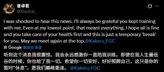 得知翔退役后,小孩曾卓君也在推特上发文,与这位亦敌亦友的选手告别。“得知这个消息我十分震惊。永远感激你与我共同训练,在我人生的低谷时期这就是一切。希望你一切安好,照顾好自己。这只是暂时的休息,愿我们能在巅峰再次相逢。”